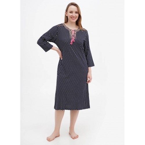 Літнє сукня в горошок. Модель приталена із двома кишенями, рукав 3/4. Машинна вишивка. На розмір 2ХL довжина виробу 108 см, довжина рукава 47 см.