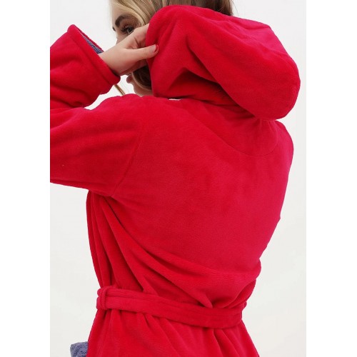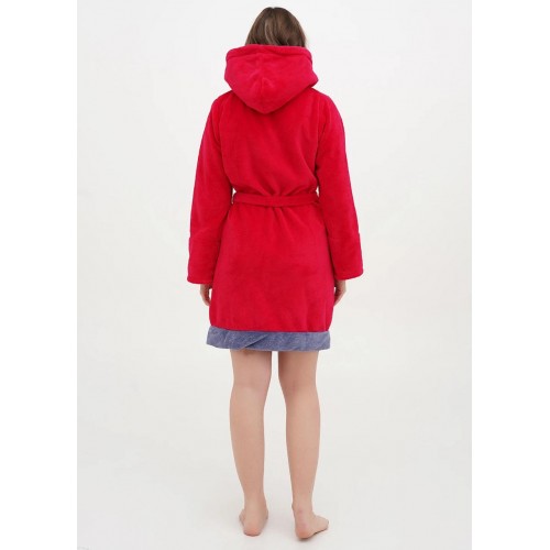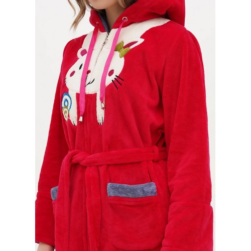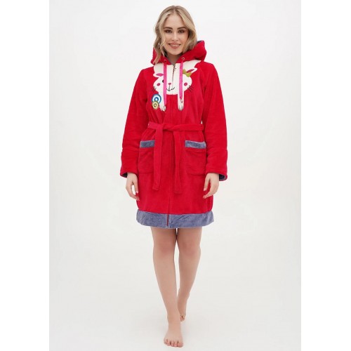 Молодіжний короткий пухнастий халат. Модель з капюшоном, довгий рукав, дві кишені, пояс. На грудях вишивка заєць. На розмір L довжина виробу 90 см, довжина рукава 59 см.