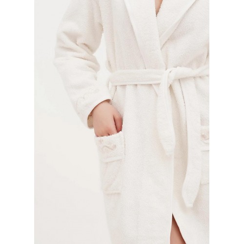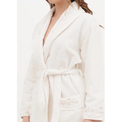 Халат натуральний жіночий махра, для дому, лазні та сауни. Модель із коміром на запах до коліна. Довгий рукав, дві кишені. Машина вишивка. На розмір XL довжина виробу 96 см, довжина рукава 53 см.