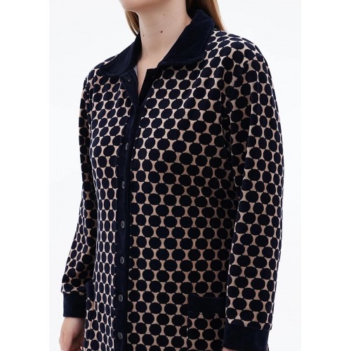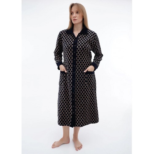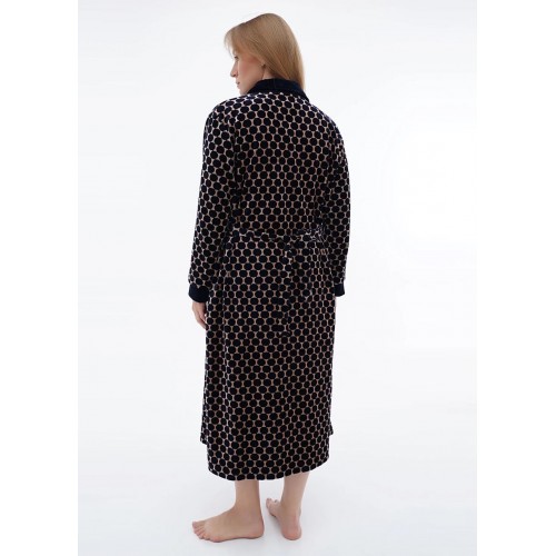 Велюровий халат на ґудзиках із довгим рукавом. Комір, дві бічні кишені, модель нижче коліна. Принт кола. Фіксуючий пояс. На розмір 2XL довжина виробу 124 см, довжина рукава 60 см.