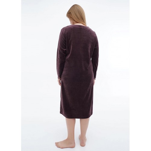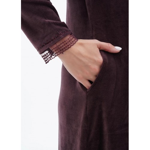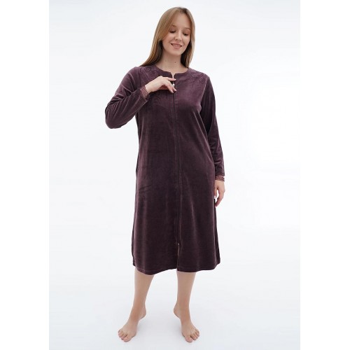 Велюровий халат середньої довжини на змійці. Довгий рукав з мереживом, дві кишені. Виріб прикрашений вишивкою та стразами. На розмір XL довжина виробу 110 см, довжина рукава 60 см.