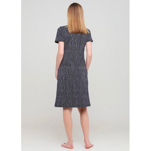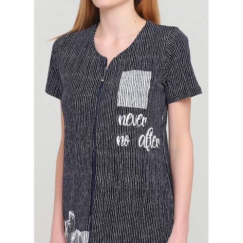 Халат на ґудзиках, короткий рукав. Виріб середньої довжини, дві бічні кишені. На розмір L довжина виробу 100 см.
