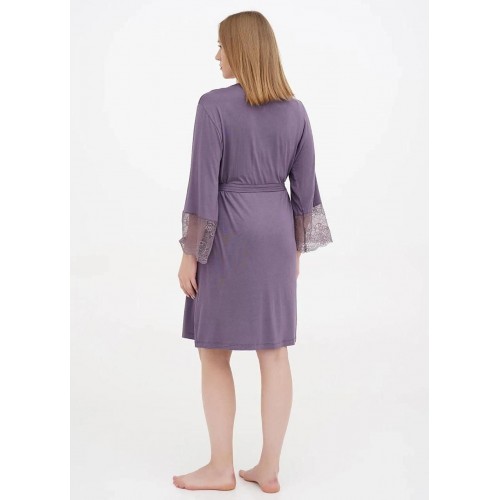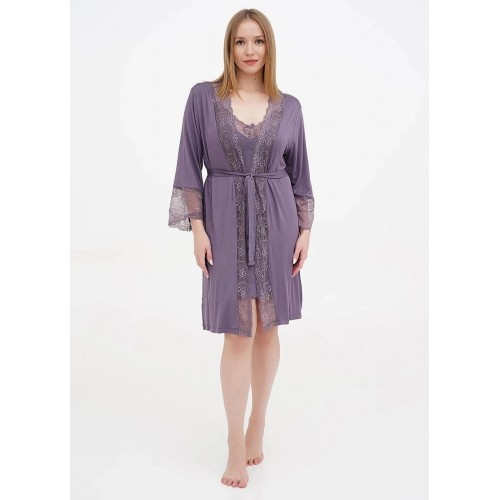 Комплект із віскози. Нічна сорочка на тонких бретелях з мереживом. Халат з поясом, рукав 3/4, вишитий мереживом. Нічна сорочка на розмір 2Xl довжина виробу 68 см. Халат на 2Xl розмір довжина виробу 102 см, довжина рукава 48 см.