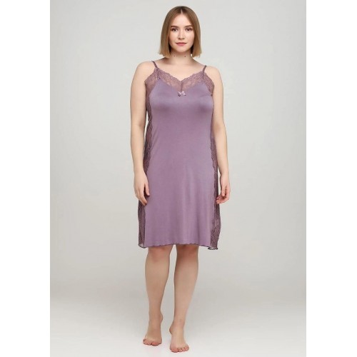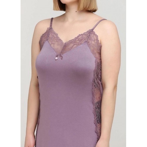 Нічна сорочка на тонких регульованих бретелях, обробка мереживо на грудях і бічному шві.