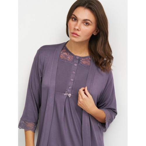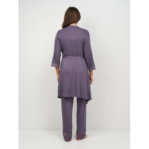 Комплект з трьох одиниць. Штани з мереживом, кофта прикрашена мереживом, на гудзиках, з коротким рукавом. Халат середньої довжини з мереживом. Рукав 3/4. З паском. На розмір XL довжина халата 96 см, довжина рукава 50 см. Довжина футболки 70 см. Довжина штанів за внутрішнім швом 81 см, ширина по низу (напівобхват) 18 см.