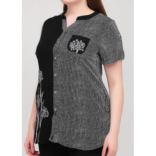 Костюм із двох одиниць. Сорочка з коротким рукавом на ґудзиках, дві бічні кишені та одна нагрудна кишеня. На розмір XL довжина виробу 83 см. Бриджі нижче за коліно, на гумці.