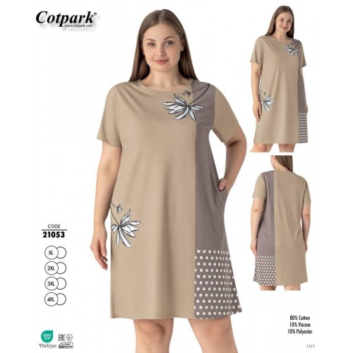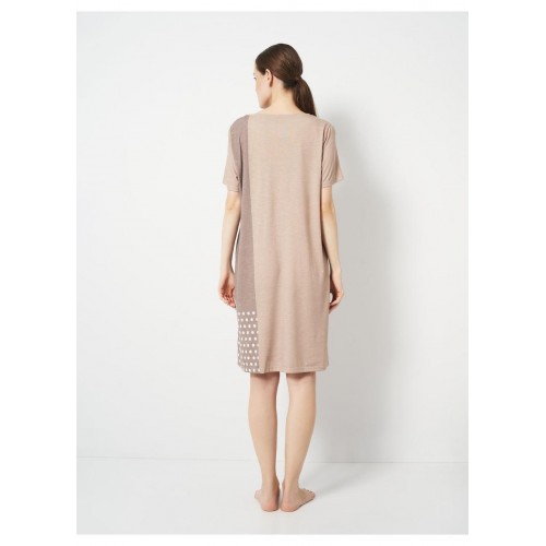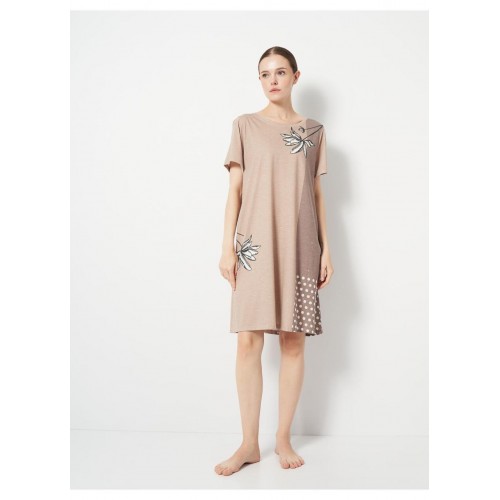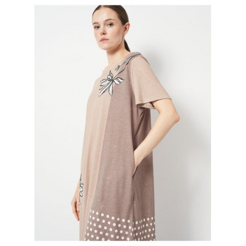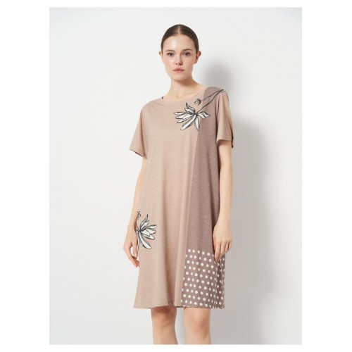 Сукня кавового кольору, вільний крій. Виріб з коротким рукавом та кишенями. Друкований малюнок та стрази