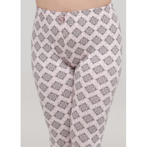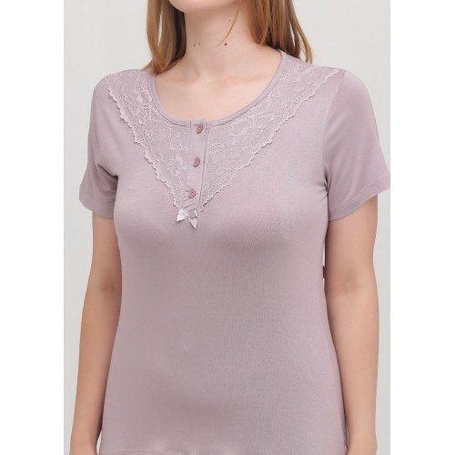 Домашній костюм із двох одиниць. Футболка з коротким рукавом, прикрашена мереживом. На розмір М довжина виробу 63 см. Штани на резинці прямого крою. Довжина внутрішнього шва 80 см, ширина по низу виробу (напівобхват) 17 см.